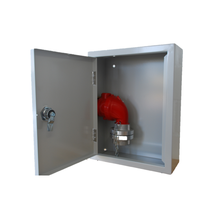 Armoire de prélèvement en acier inoxydable V2A pour colonnes montantes sèches selon la norme DIN 14461-2, avec charnières en acier inoxydable et serrure de pompiers DIN 14925. Panneau de signalisation extérieur adhésif 210 x 74 mm avec inscription "prélèvement d'eau d'extinction pour sapeurs-pompiers" selon DIN 4066.