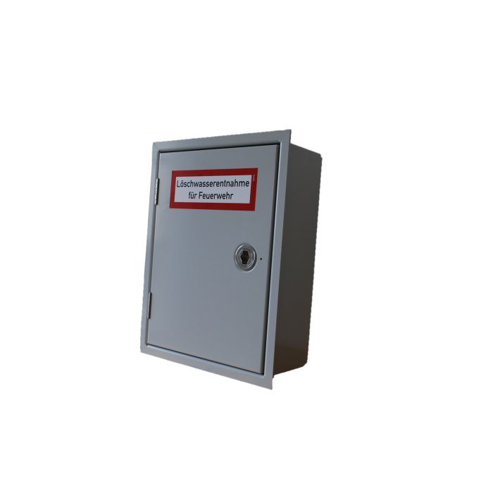 Armoire de prélèvement en tôle d'acier galvanisée pour colonnes montantes sèches. Couche d'apprêt gris clair (RAL 7035), selon la norme DIN 14461-2, avec charnières en acier inoxydable et serrure de pompiers DIN 14925. Panneau de signalisation extérieur adhésif 210 x 74 mm avec inscription "prélèvement d'eau d'extinction pour sapeurs-pompiers".