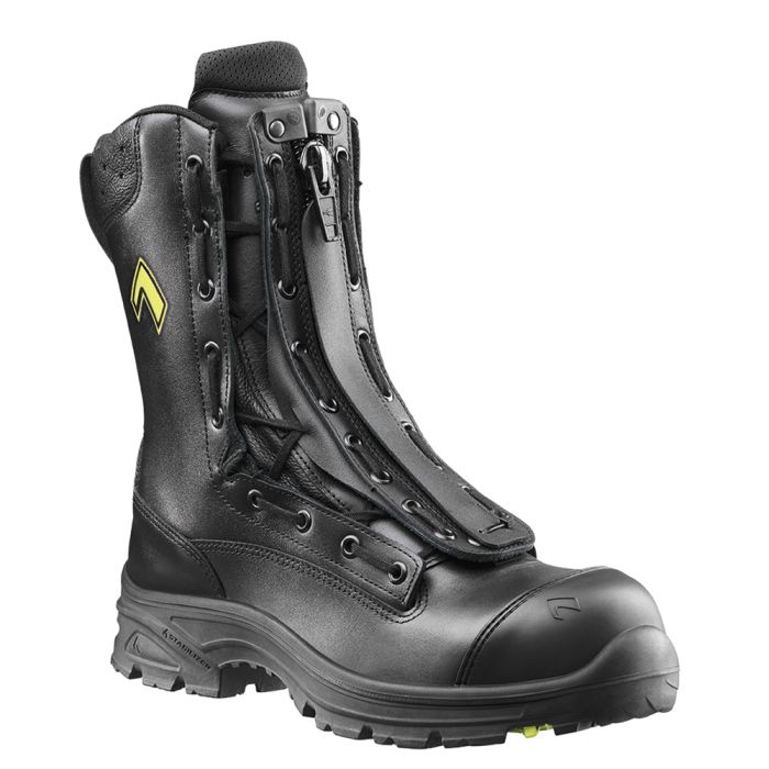 Fermeture éclair pourvue d'une boucle en cuir, d'un rabat et renforcée à la déchirure. Fixation de la fermeture éclair HAIX EasyZip (remplaçable), boucle d'enfilage à l'arrière, lacets NOMEX, fixation du lacet et boucle d'enfilage, capuchon en caoutchouc, flexion du talon et insert de flexion au niveau du cou-de-pied.