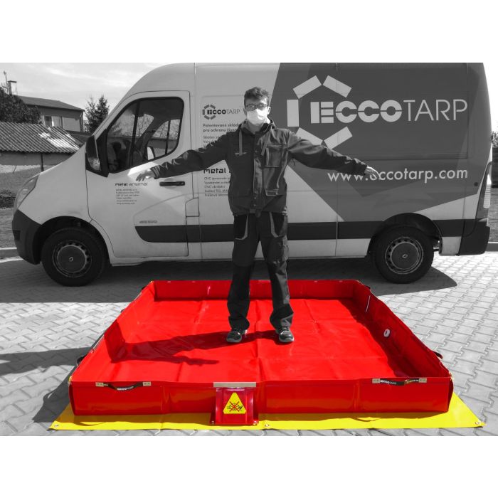 Bac de rétention/décontamination pliable, spécialement conçu pour répondre aux exigences et aux besoins des sapeurs-pompiers et de la protection civile. Outre la décontamination de personnes et d'équipements, le bac peut également être utilisé pour recueillir des substances (dangereuses).