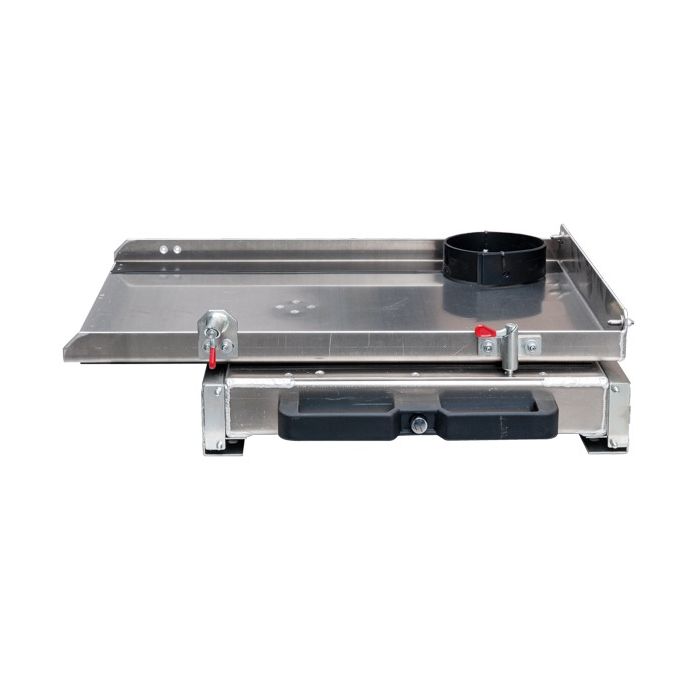 Grundkörper Aluminium, kugelgelagerte Auszugschienen aus Stahl verzinkt, teleskopartig ausziehbar, Lagerschale aus Aluminium, Doppelhandgriff und Druckknopfentriegelung.