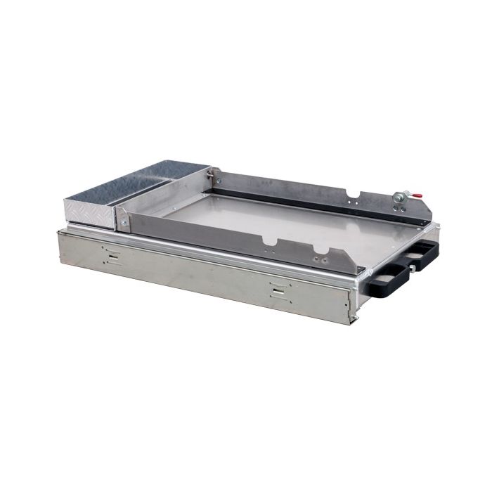 Grundkörper Aluminium, kugelgelagerte Auszugschienen Stahl verzinkt, teleskopartig ausziehbar, Aufbauschienen Edelstahl.